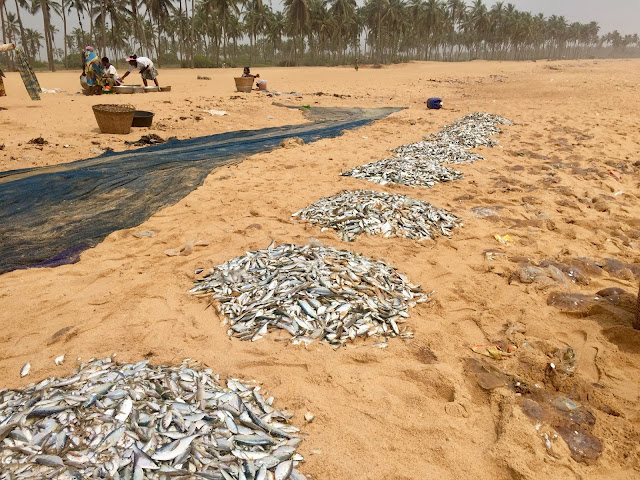 Seguimos hasta Cotonou por la costa, atravesando una pista de unos 20 km junto a interminables cabañas de bambú en la misma arena de la playa, bajo altos cocoteros, desde donde nos saludaban con la mano "yovo-yovo!" cuando nos asomábamos por la ventanilla; hicimos un par de paradas para poder ver de cerca a los pescadores en la playa haciendo un complejo trabajo de recogida de redes, sincronizados y entusiasmados por la pesca del día. Muchos eran de Ghana. Se negaron a que les sacásemos fotos, ni pidiendo permiso. Solo de parte de la pesca. Brutal.